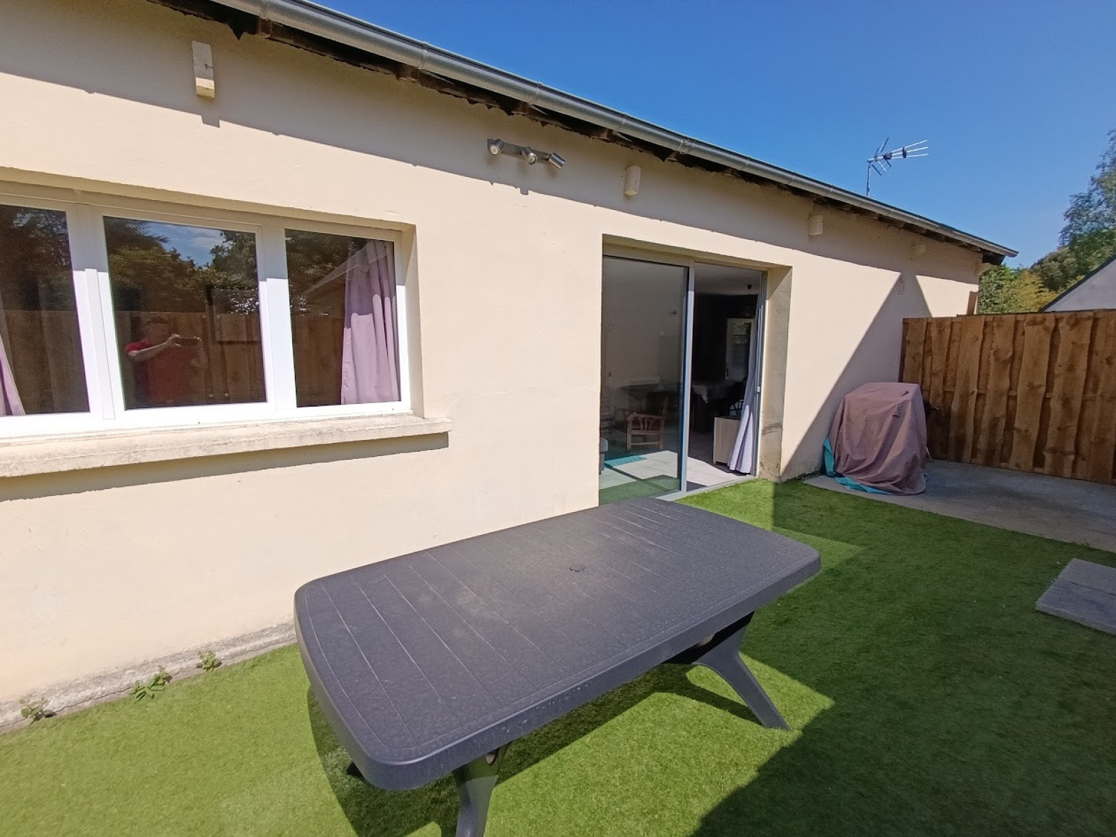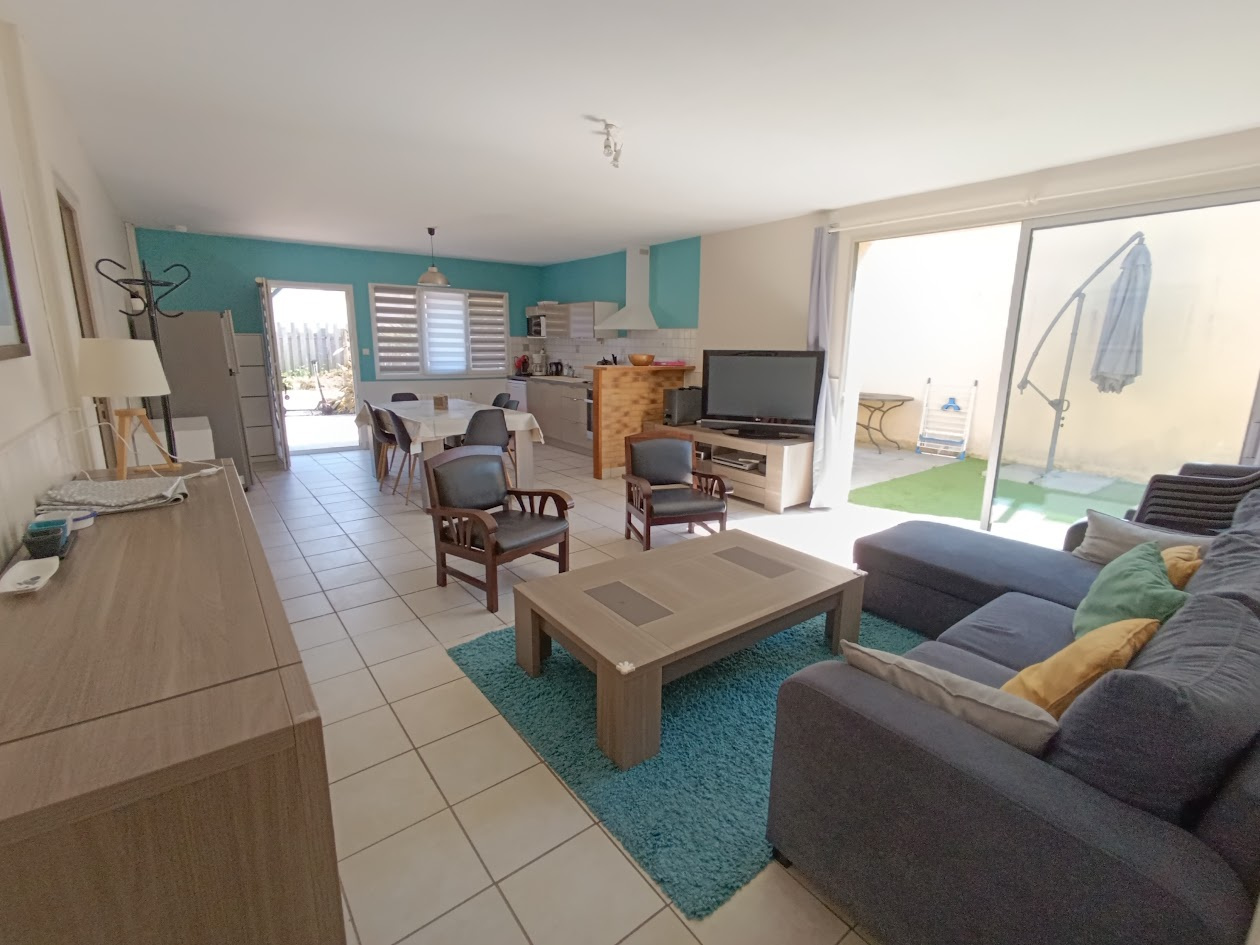 Vaste de Salon/Séjour lumineux avec cuisine ouverte, 3 belles chambres, une salle d'eau avec WC, un cellier. Une belle parcelle d'environ 420m² bien proportionnée.