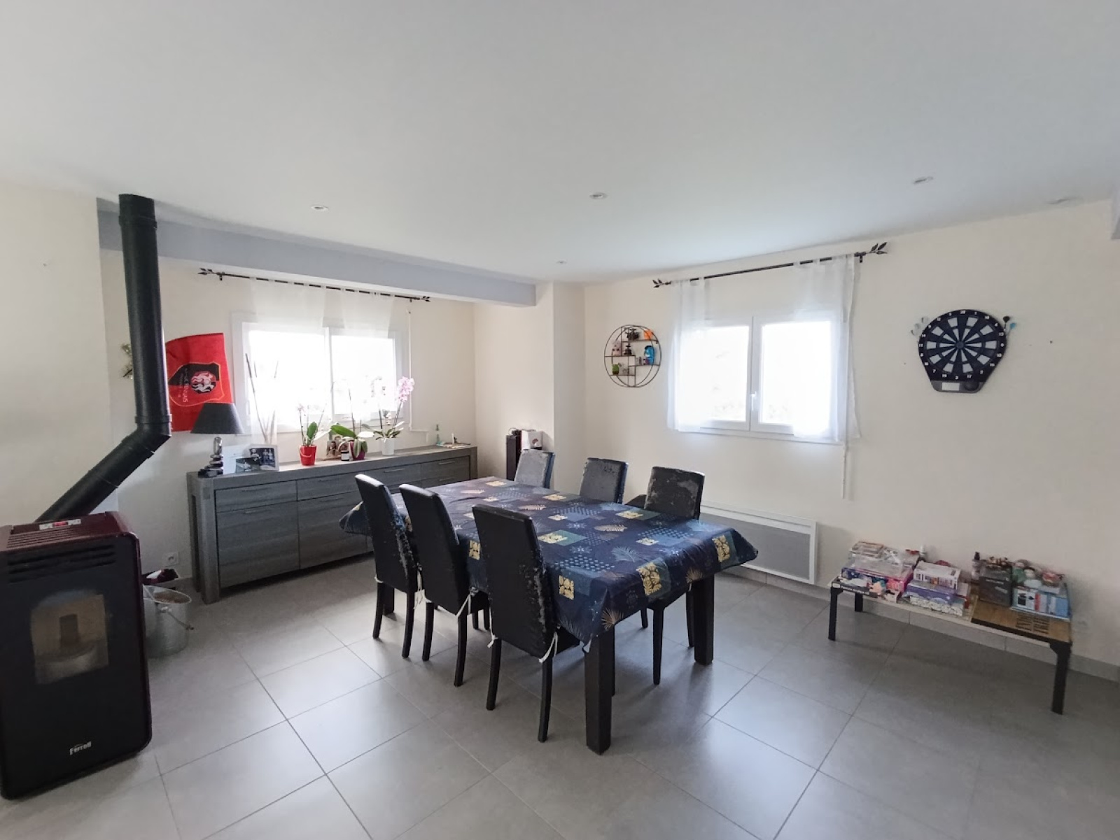 En rez-de-chaussée, une entrée avec placard, WC, vous emmène vers une vaste pièce de vie d'environ 50m², lumineuse avec accès terrasse et jardin au sud. Cette pièce dispose d'une cuisine aménagée et équipée d'un salon/salle à manger avec son poêle à granules efficace qui permet de se passer des convecteurs. Le garage d'environ 18m² peut rester ainsi ou devenir une suite parentale avec salle d'eau et dressing.