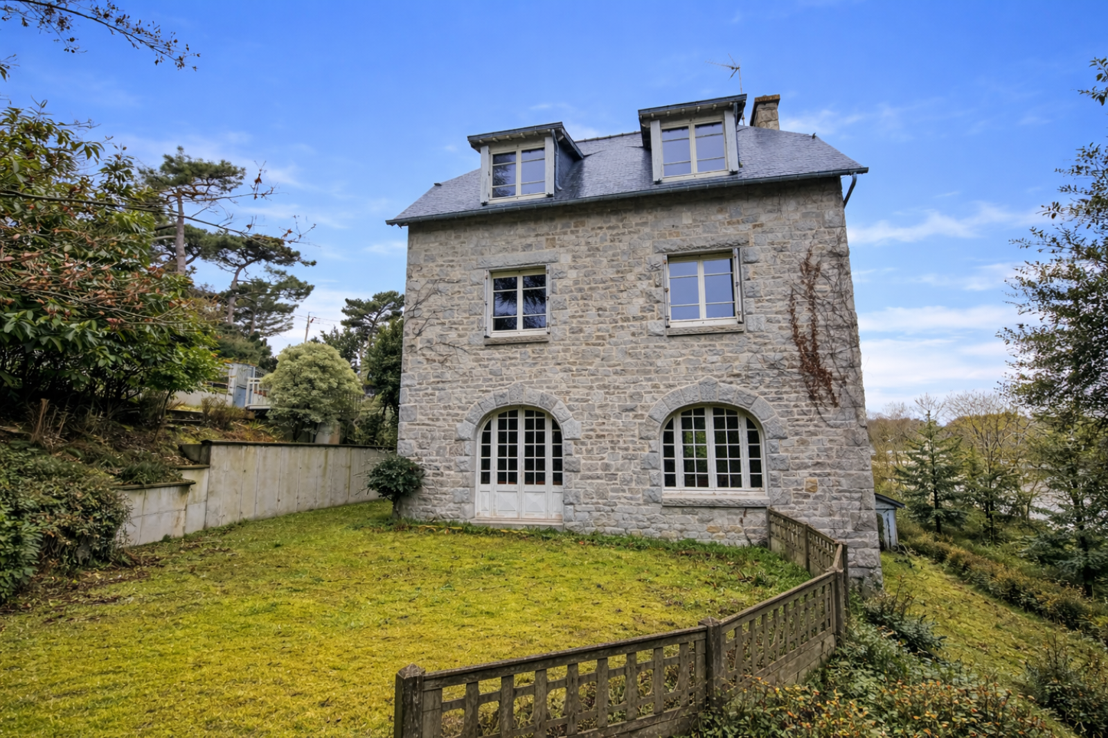 AIS SAINT CAST LE GUILDO - Située à moins de 300m de la Grande Plage, cette maison à usage d’habitation bénéficie d’un environnement agréable et verdoyant. Elle est implantée sur un terrain clos et boisé, sur le côté et à l’arrière de la maison, offrant un cadre intime et propice à la détente. La maison comprend une cave en sous-sol (sous une partie de la maison), idéale pour le stockage. En rez-de-jardin, une entrée dessert un séjour-salon chaleureux avec poêle à bois, créant un espace de vie convivial. La cuisine, attenante, permet un aménagement fonctionnel au quotidien. Ce niveau dispose également de WC indépendants. En rez-de-rue, accessible par une passerelle, vous trouverez une seconde entrée menant à une pièce de vie, deux chambres confortables, un espace bureau ainsi qu’une salle de bains avec WC. Cet espace peut facilement convenir à un usage indépendant selon les besoins. À l’étage, un palier à usage d'espace détente dessert trois chambres offrant de beaux volumes, ainsi qu’une salle de bains équipée d’une douche et d’un WC. Grâce à sa configuration et à ses différents niveaux, cette maison s’adapte aussi bien à une résidence principale qu’à une maison de vacances ou un projet locatif. Un bien à découvrir rapidement sur le secteur de Saint-Cast-le-Guildo.
