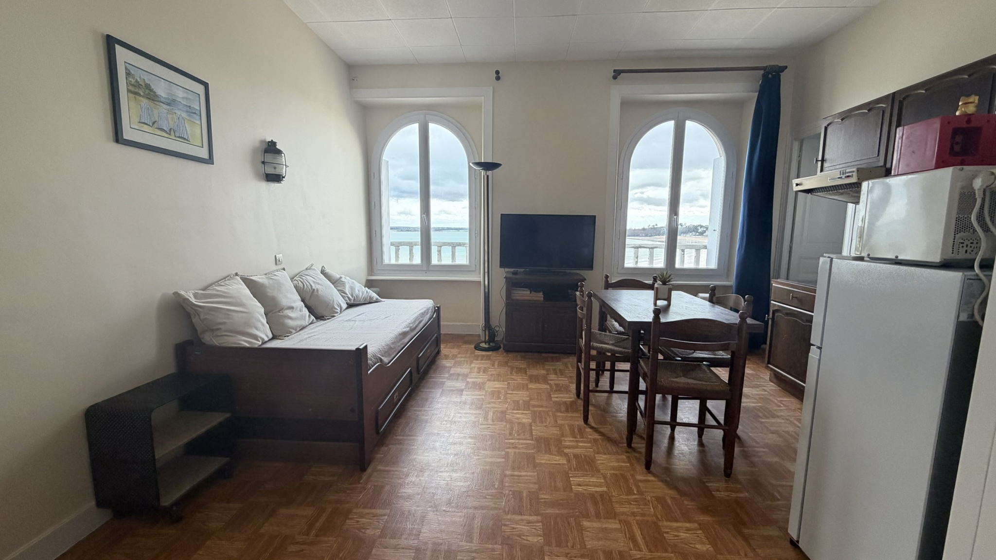 EXCLUSIF, Dans un bel immeuble en pierres (résidence LA JABOTIERE) , à 100 m de la grande plage, Sympathique studio très lumineux au 4 éme et dernier étage sans ascenseur, d'une petite copropriété offrant une belle pièce de vie avec cuisine de 20 m² environ avec pleine vue mer sur le port et la plage, salle d'eau avec wc. le tout pour une superfice "loi carrez" de 24, 15 m².