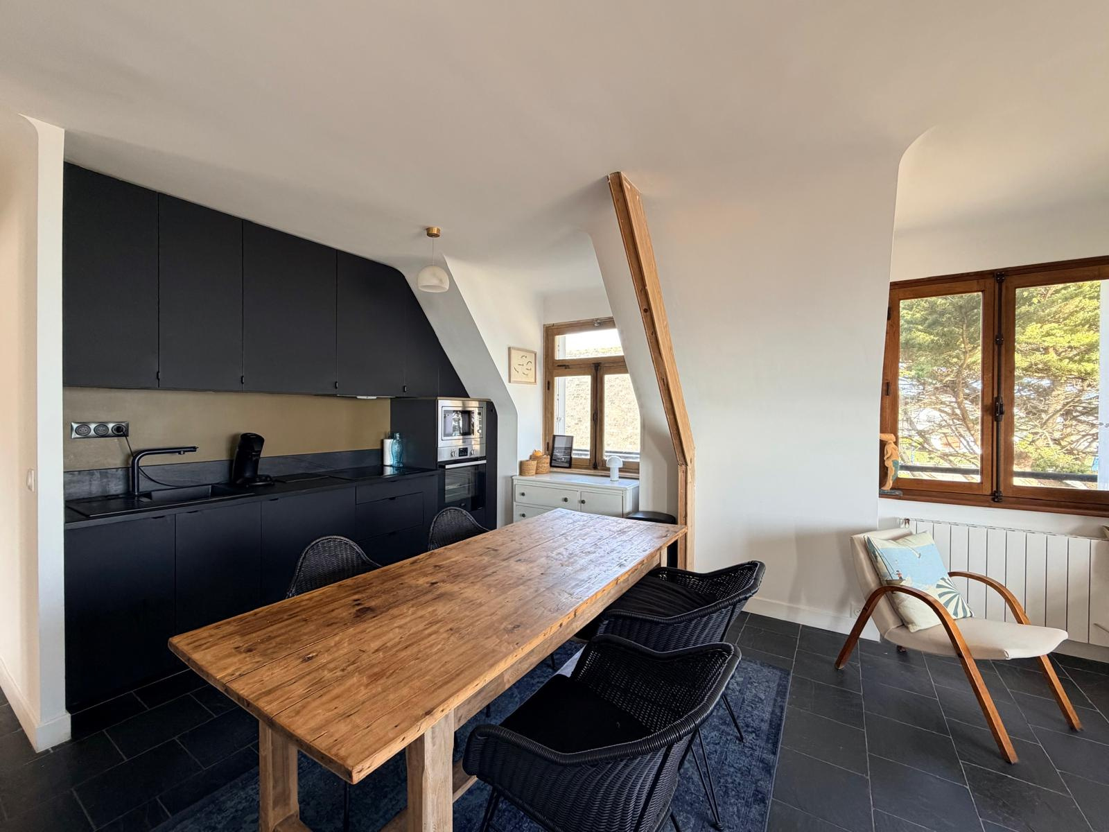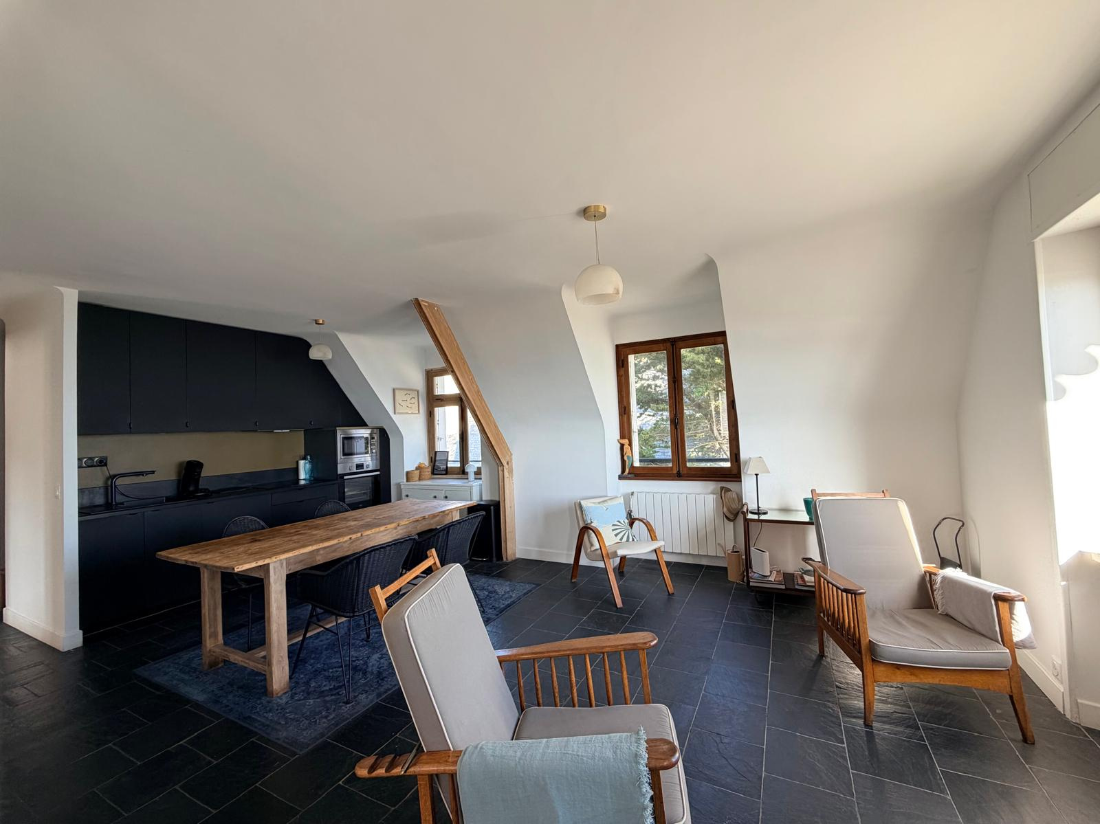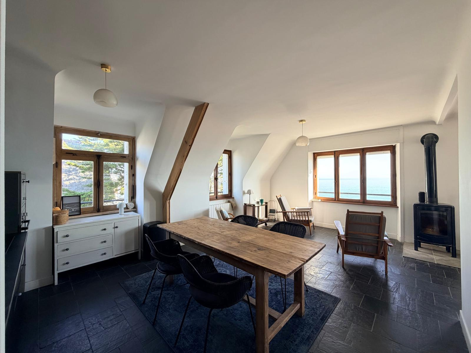 AIS SAINT CAST LE GUILDO - Situé à en face de la grande plage, cet appartement de type 3 bénéficie d’un emplacement privilégié et d’une vue mer depuis l’ensemble des pièces. Au deuxième étage d’un immeuble de caractère en pierre, ce bien entièrement rénové avec goût offre des prestations de qualité et un cadre de vie lumineux et apaisant. Il se compose d’une entrée avec placard, d’un agréable séjour baigné de lumière avec cuisine aménagée et équipée, le tout ouvert sur une magnifique vue sur mer. L’espace nuit comprend deux chambres avec placards, ainsi qu’une salle d’eau moderne et un WC indépendant. Au dessus, des combles aménageables permettant d'obtenir une surface totale de 84m² carrez. Un cellier vient compléter ce bien. Un appartement rare, alliant charme de l’ancien, confort moderne et situation idéale sur le littoral breton.