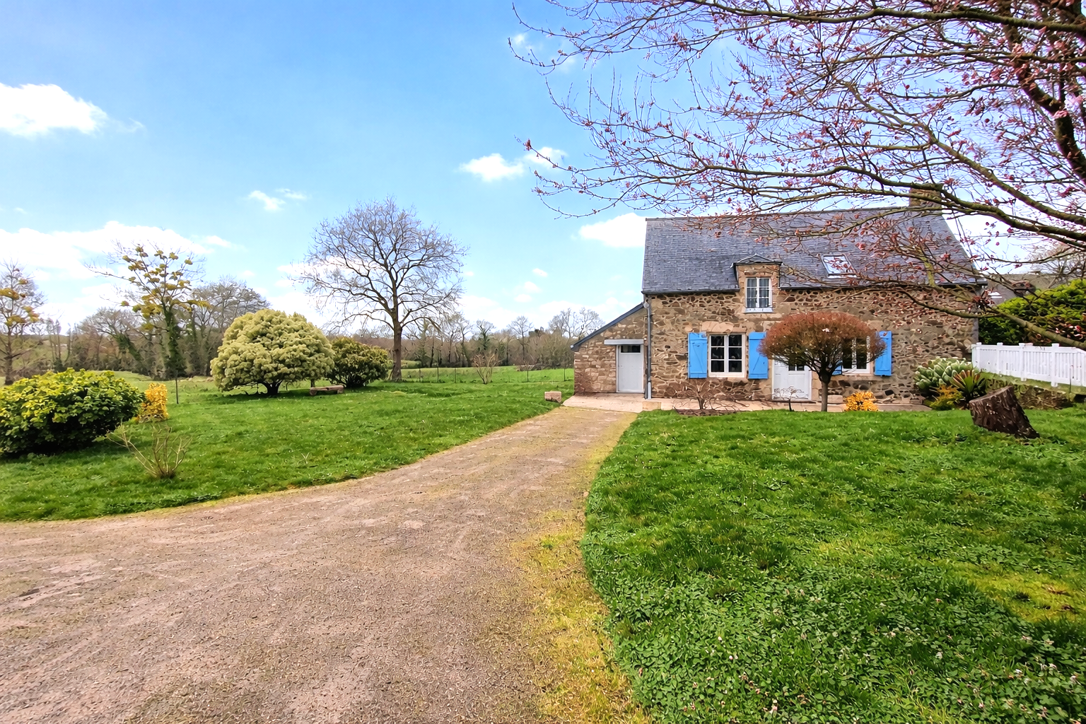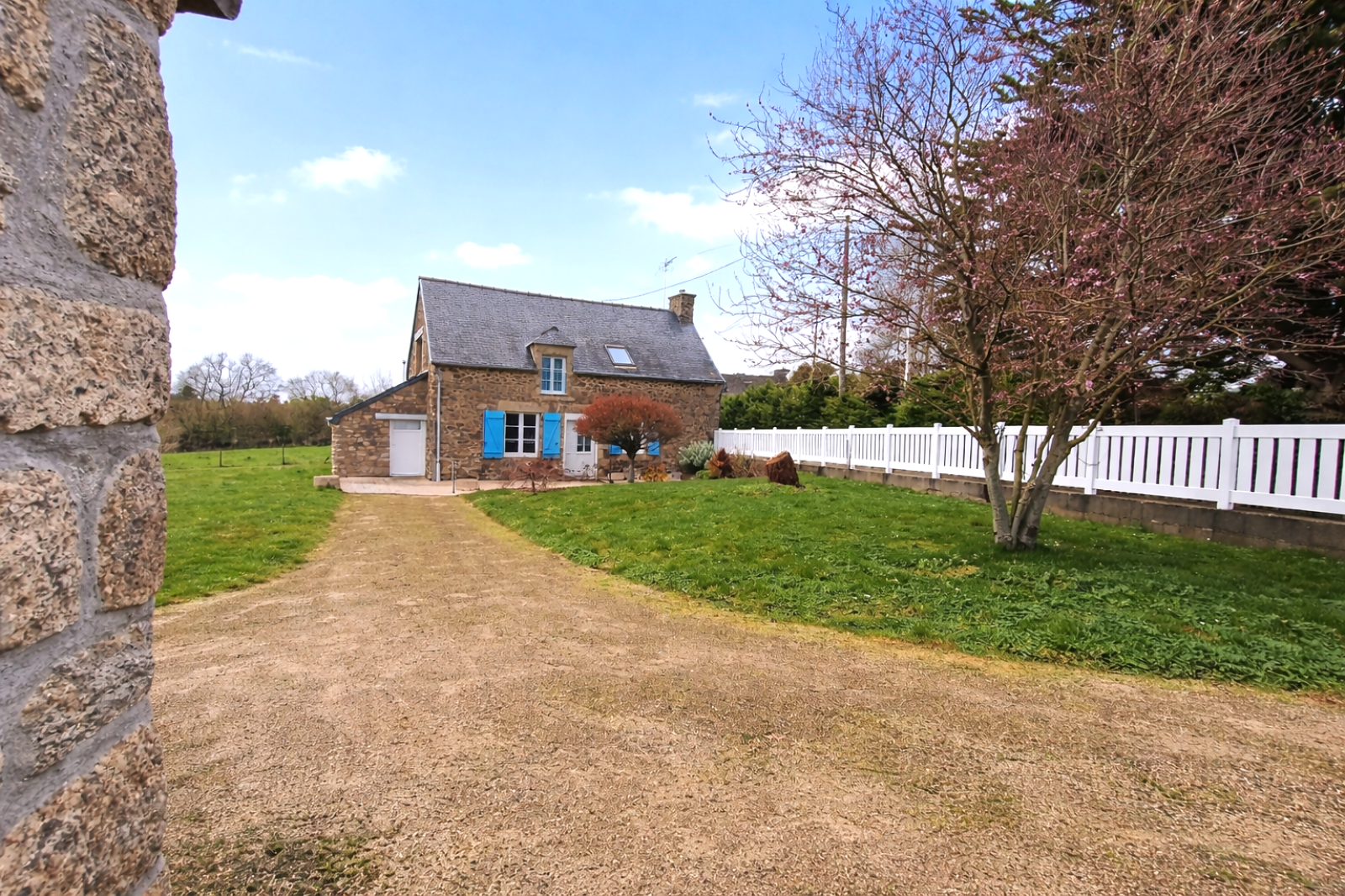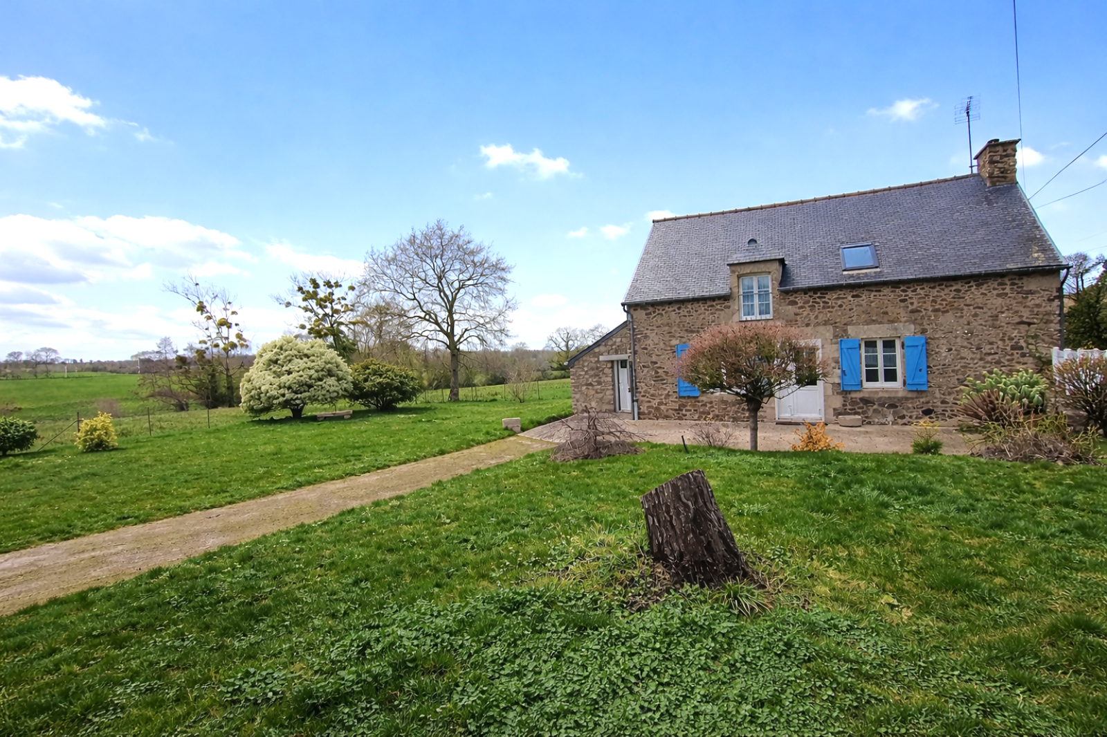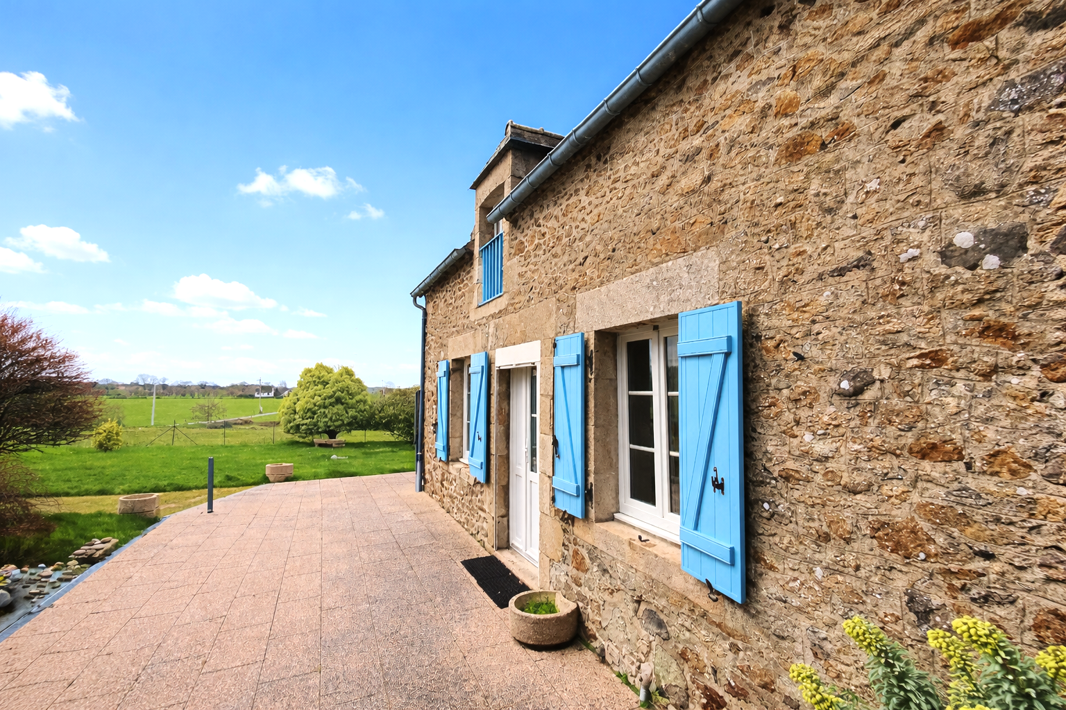 Sa façade de caractère aux volets bleus, sa terrasse ouverte sur la nature et son environnement sans nuisance composent un cadre idéal pour se ressourcer.