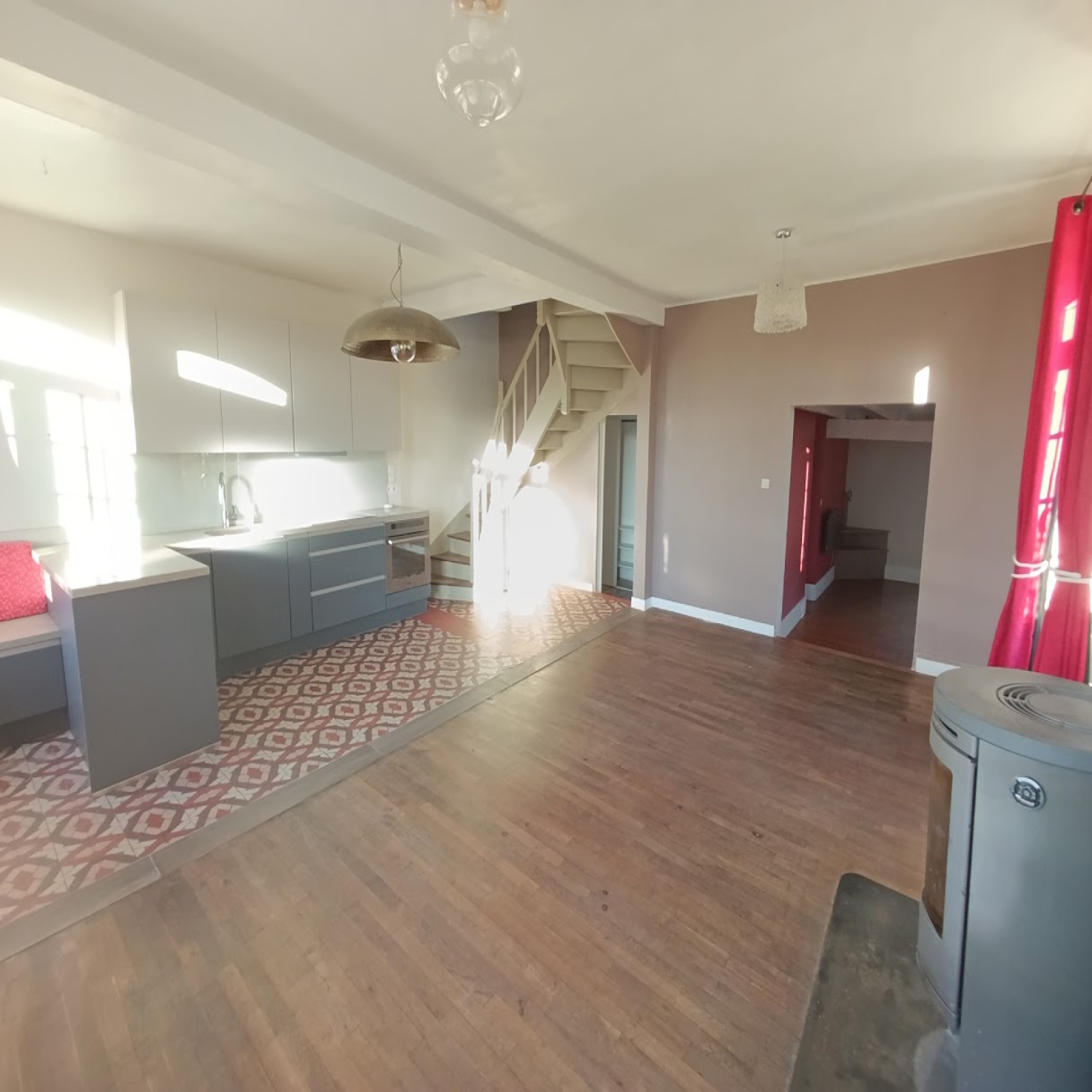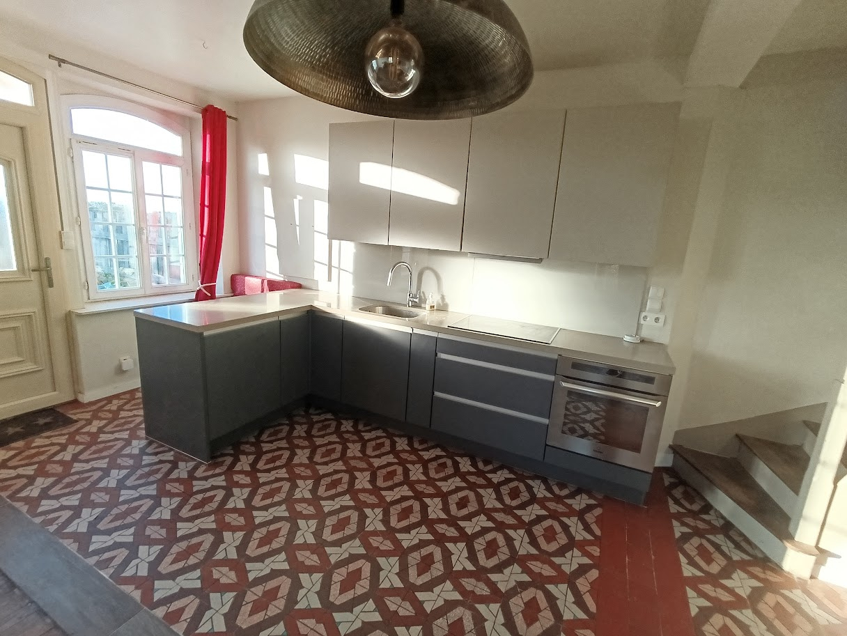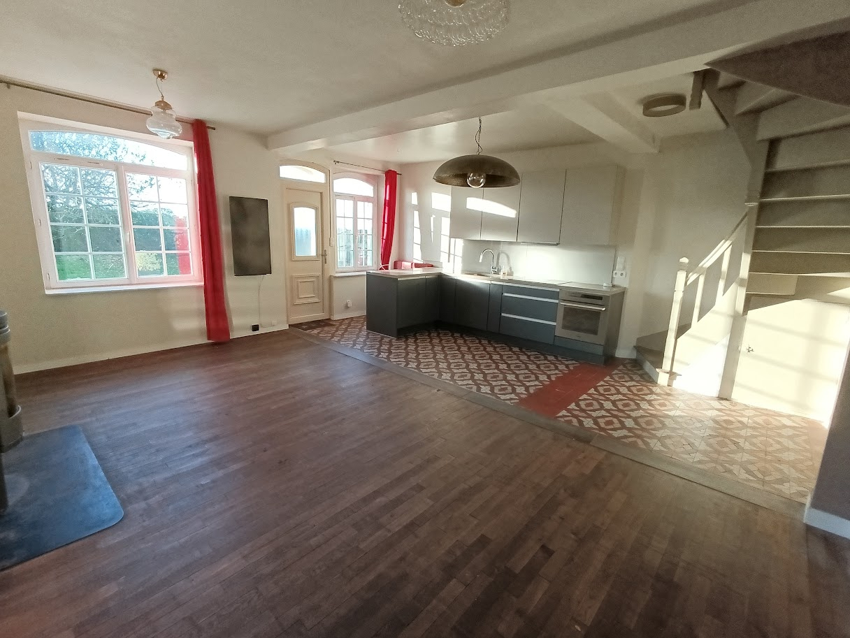 La maison offre en rez-de-chaussée une pièce de vie avec cuisine ouverte aménagé et équipée communiquant avec la salle à manger équipée d'un poêle permettant des moments conviviaux, un salon cocoon, légèrement décalé, une chambre et un cellier (nombreux placards).