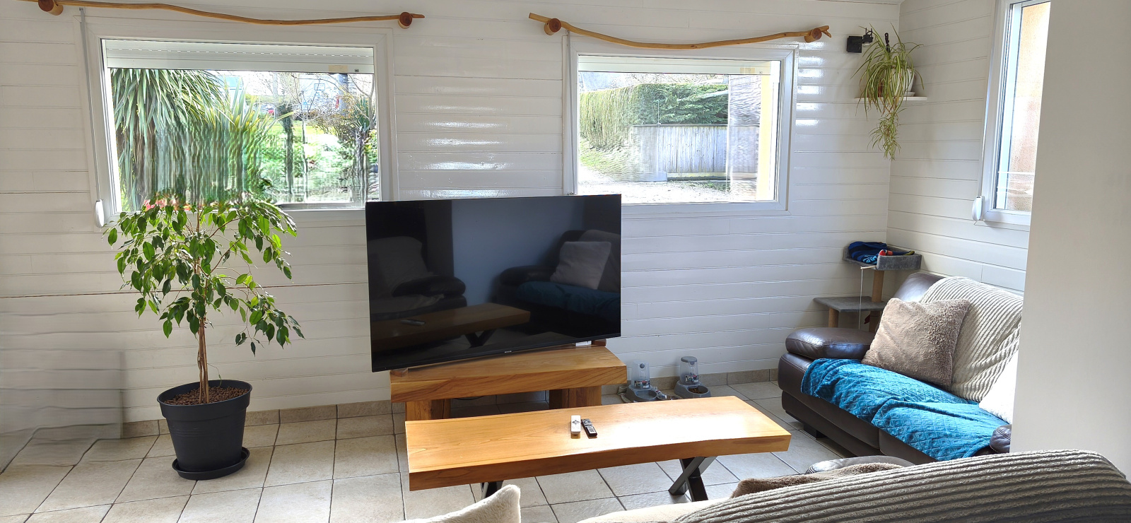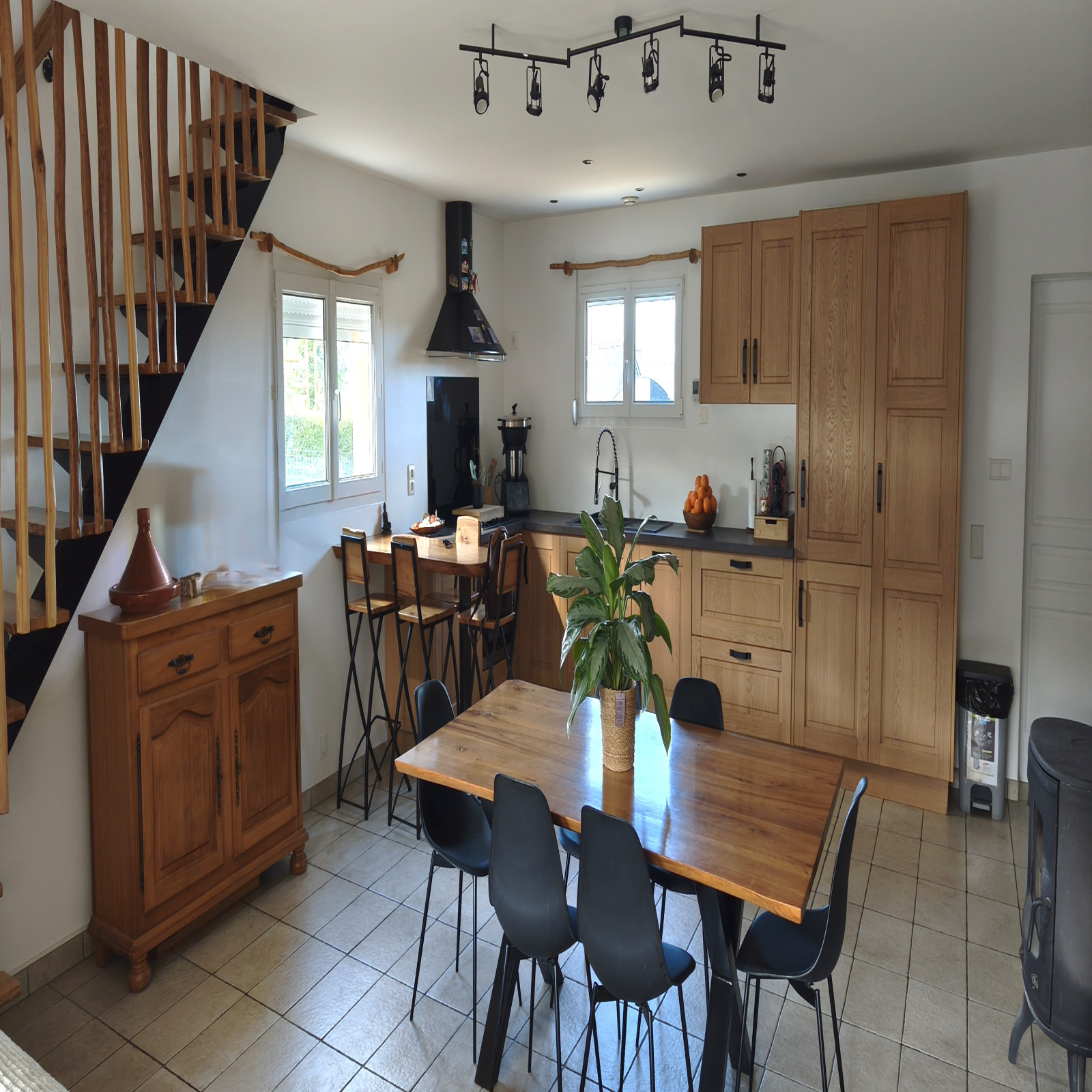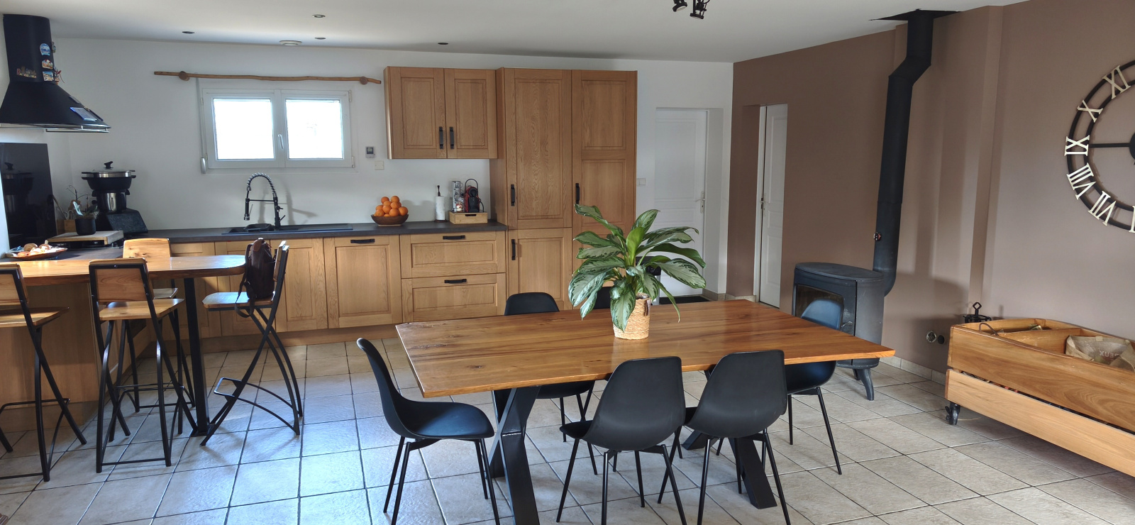 Édifiée sur un terrain arboré et végétalisé de 2 200 m², elle développe 110 m² habitables. La pièce de vie, chaleureuse et lumineuse, accueille une cuisine américaine équipée ouverte sur le séjour, sublimé par un poêle à bois. Une grande pièce attenante fait office de buanderie et bureau.