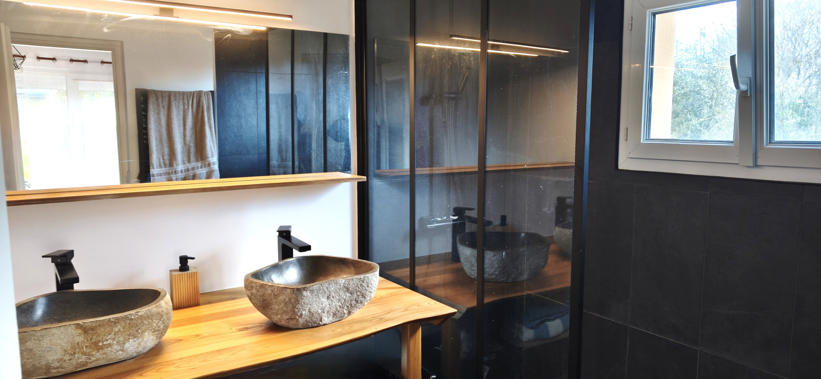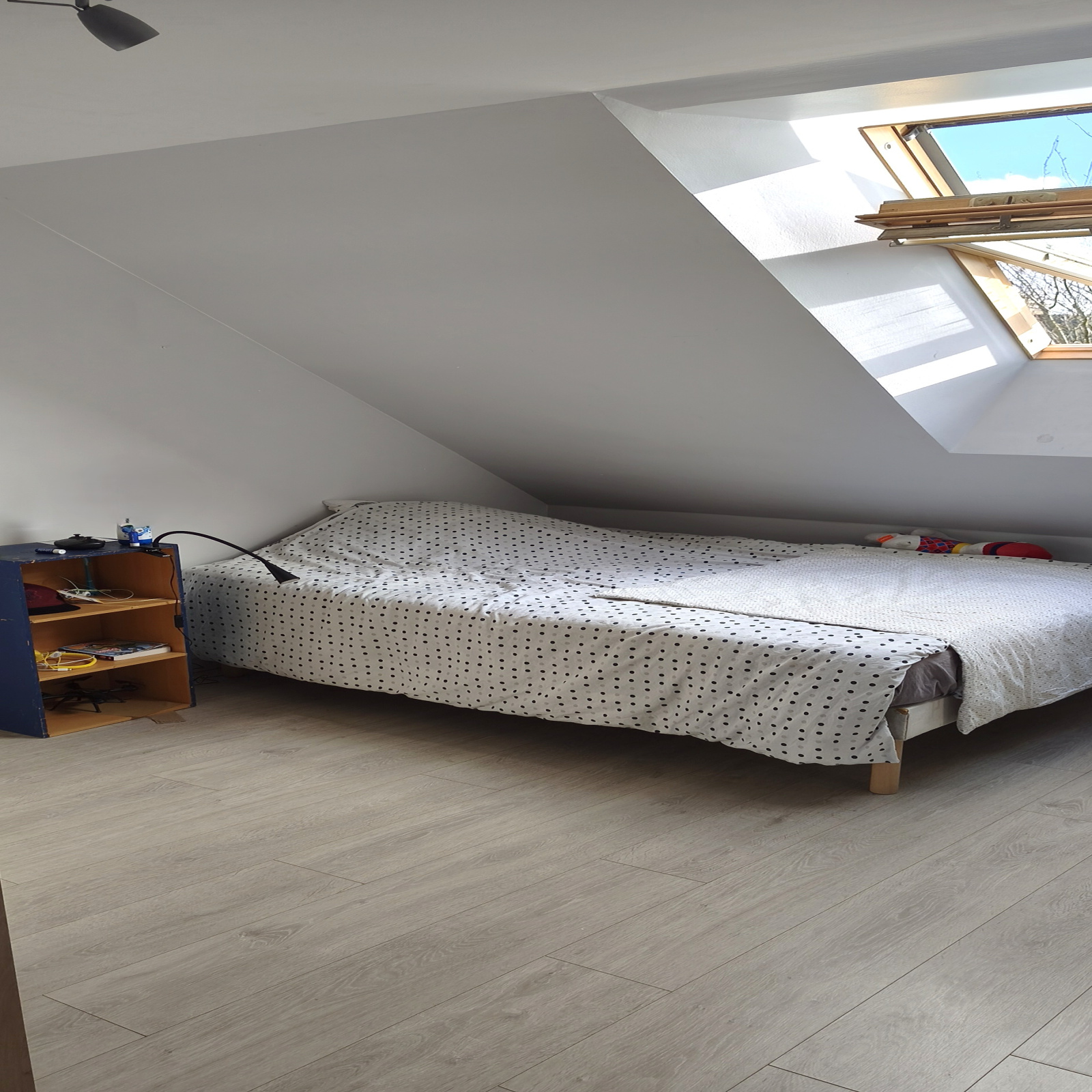 La suite parentale en rez-de-chaussée, avec salle d’eau privative, assure un confort de plain-pied.
