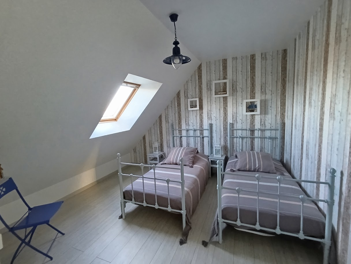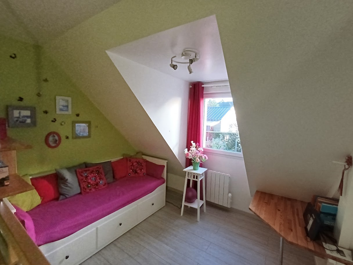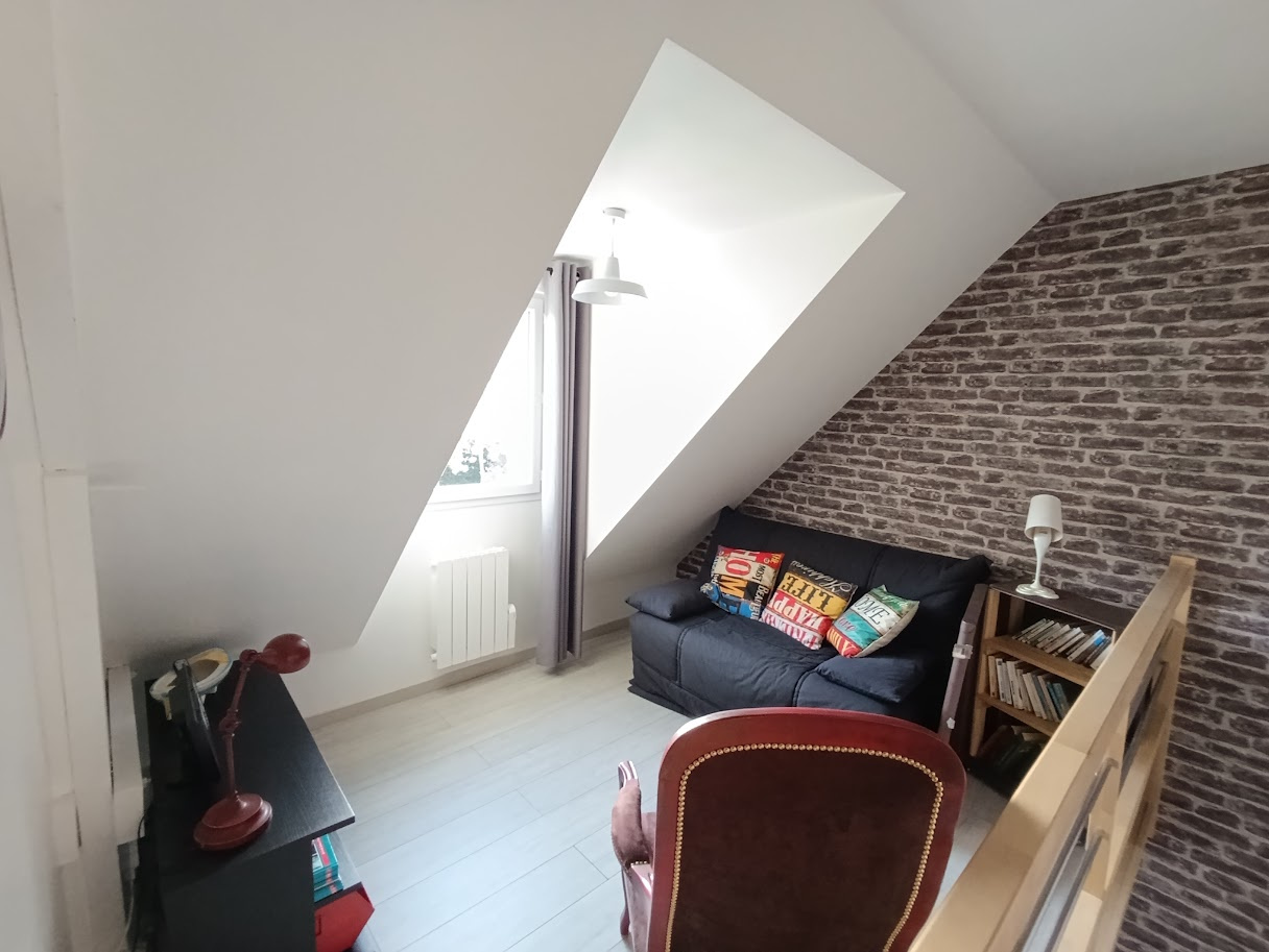 A l'étage, espace bureau/couchage d'appoint sur palier mezzanine, deux chambres, WC, salle d'eau.